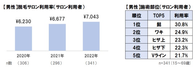 ・1回あたり利用金額は女性が8,882円(前年比537円減)に対して、男性は7,043円(前年比366円増)と、2年連続で利用金額が上昇。男性の施術部位で最も利用率が高いのは3年連続「髭」。